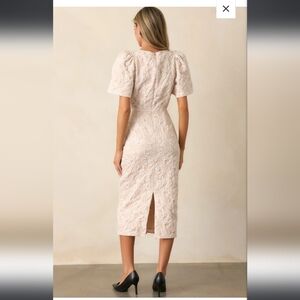 Chic midi dress with a textured design. Features stylish black bow accents. Perfect for formal occasions.