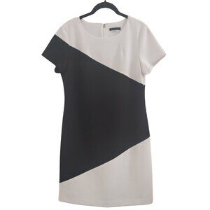 Classic and chic, this Tommy Hilfiger sheath dress features a modern diagonal colorblock design in black and ivory tones — a timeless look for work, business meetings, or dinner outings.
