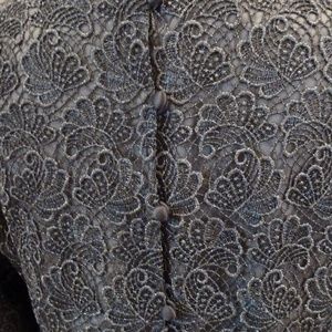 Talbots Evening top, EUC. As new. Gray and metallic Guipure lace, 3/4 sleeve, jewel neckline, sateen covered back buttons, loop closure. 80% Polyester, 20 % Metalic. The metalic threads give the top a bit of a shimmer and adds depth to the color. Bust 20" across, Waist 18 1/2" across, Bottom 19 1/2" across, Sleeve length 19", Back length 19 1/2", Underarm to hem 11".