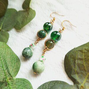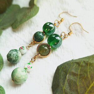 Step into a world of natural elegance with these handcrafted earrings, designed for lovers of vintage-inspired, cottagecore, and whimsigoth aesthetics. Featuring polished green spot jasper, Indian agate, white floral millefiori glass beads, and pearlescent Czech glass beads, these earrings beautifully blend earthy charm with fairy-tale whimsy. The rich greens and delicate floral details evoke the magic of an enchanted forest, making them a perfect accessory for nature lovers and free-spirited souls.