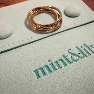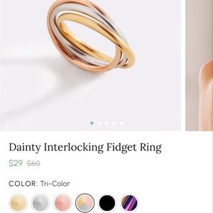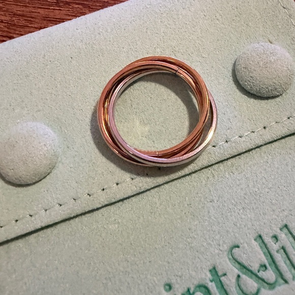 This elegant tri-color interlocking ring features a stunning combination of gold, silver, and rose gold tones. Perfect for adding a touch of sophistication to any outfit.
