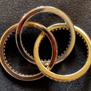 This stunning tri-color interlocking ring set features gold, silver, and rose gold tones. Perfect for adding a touch of elegance to any outfit.