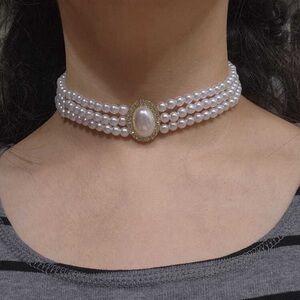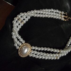 ✨ Elegant Triple-Strand Pearl Choker with Opalescent Centerpiece✨ New