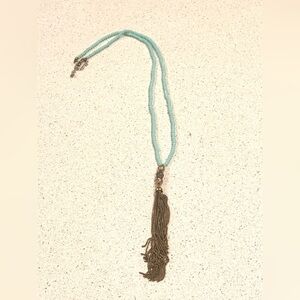 This stunning necklace features vibrant turquoise beads paired with a luxurious gold tassel. Perfect for adding a touch of elegance to any outfit.