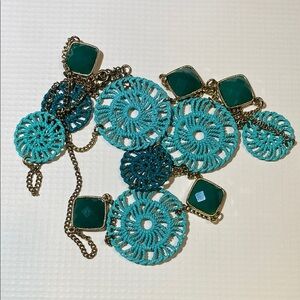 This stunning necklace features intricate turquoise and gold designs, perfect for adding a touch of elegance to any outfit.  Costume jewelry, unbranded.