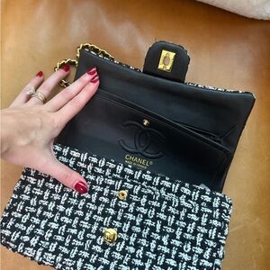 This stylish shoulder bag features a classic tweed design in black and white. The elegant chain strap adds a touch of sophistication, making it perfect for any occasion.