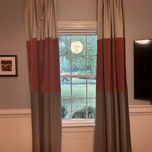 Enhance your living space with these elegant three-tone curtains designed by the world renowned Janie Molster. Fabric is a combination of a muted pink velvet & woven grey and cream. I have an additional set I will add , these drapes will add a touch of sophistication to any room.