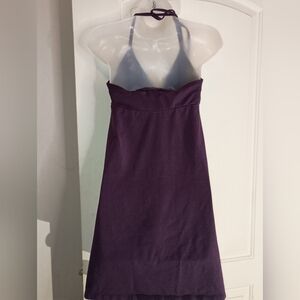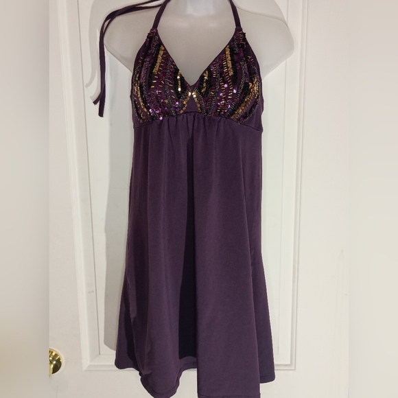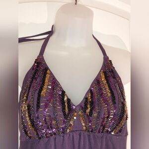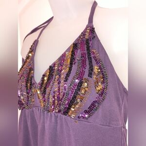 This is a purple halter dress . The dress has a fitted bodice adorned with sequins and beads in shades of purple, gold, and black, creating a decorative pattern. The skirt of the dress is plain and flows down from the waist, giving it a slightly flared appearance. The halter straps are tied at the back of the neck. The dress is made of a soft, lightweight fabric.