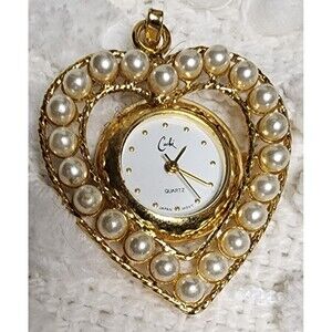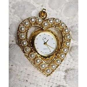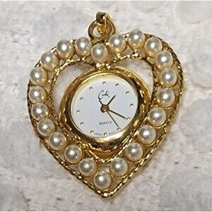Elegant VINTAGE GoldTone Heart CACHI Pearl Endowed PENDANT Pocket Watch EuC