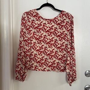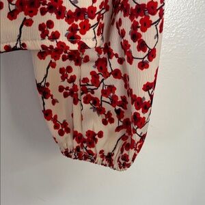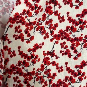 Elevate your style with this elegant V-neck floral blouse. The red and cream pattern adds a sophisticated touch to any outfit. Perfect for pairing with your favorite jeans or a chic skirt.