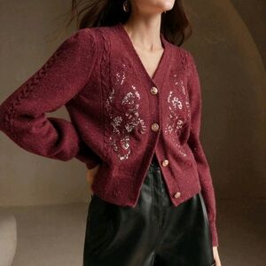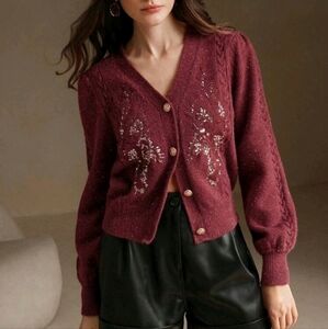 Elegant V-Neck Sequin Decor Flared Sleeve Knitted Cardigan,Women's Christmas