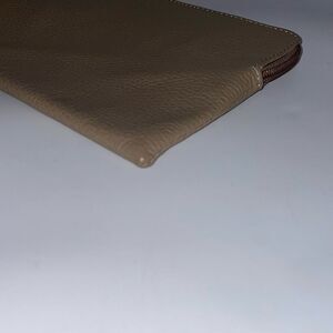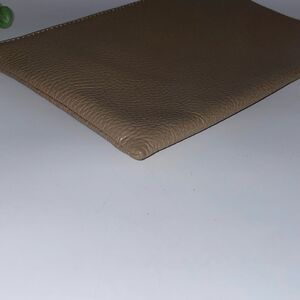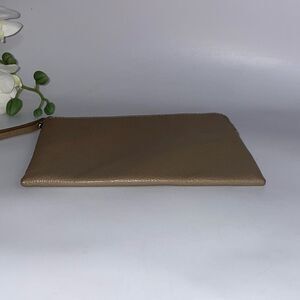 This elegant tan leather Valentina clutch/wristlet is perfect for any occasion. Its sleek design and neutral color make it a versatile accessory for your wardrobe.