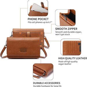 Features: This designer-inspired small crossbody is thoughtfully designed with 8 card slots, a clear ID window, and multiple pockets for your essentials like phone, keys, cards, passport, small cosmetics, and cash. Made from high-quality vegan leather that feels soft and wears beautifully over time, with durable metal accents. The RFID-blocking feature offers peace of mind by protecting your personal info from scanning. The adjustable strap means it can be worn as a crossbody, shoulder bag, or tucked inside a larger tote.
