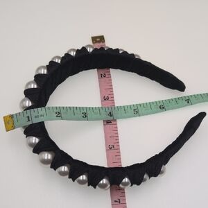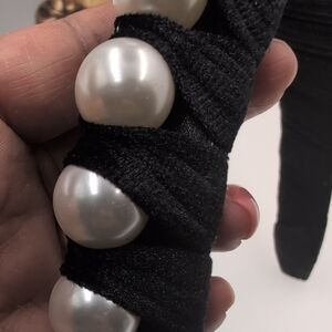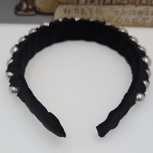 This elegant black headband features beautiful pearl accents, perfect for adding a touch of sophistication to any outfit.