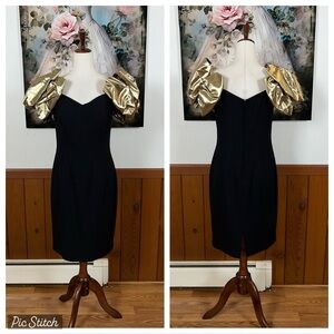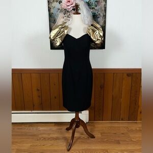 Chic black mini dress with bold gold puff sleeves. Perfect for a standout look. Great condition! Bust measures 34”, waist is 32”, hip is 40”, length is 39”
