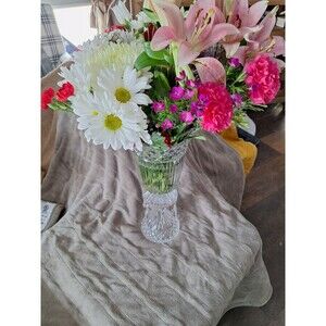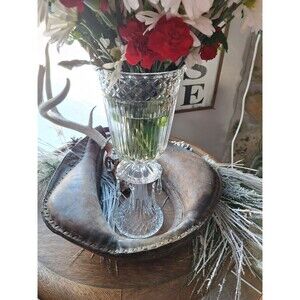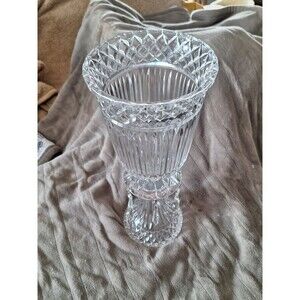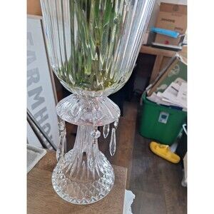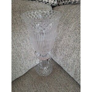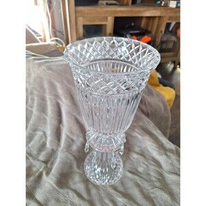 Add a touch of elegance and sophistication to any room with this stunning vintage glass vase. Crafted using pressed glassmaking technique, this 16 inch tall vase features a beautiful ribbed and flared design that is sure to catch the eye of any visitor. The vase is finished with a shiny coat and comes in a clear color, making it a perfect addition to any decor. This vase is suitable for all occasions and can be placed on a desk, counter, or table to add a touch of class to any space. It weighs between 10 lbs and is an original piece from the late 20th century