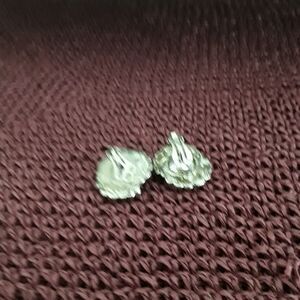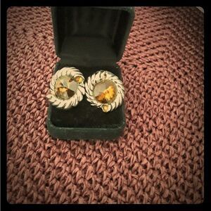 Step into timeless glamour with these exquisite vintage clip-on earrings. Featuring a striking faceted central gemstone—reminiscent of amber or citrine—framed by a twisted rope-style border in rich gold and silver tones. The scalloped design adds a touch of old-world charm, while the clip-on backs make them perfect for non-pierced ears.