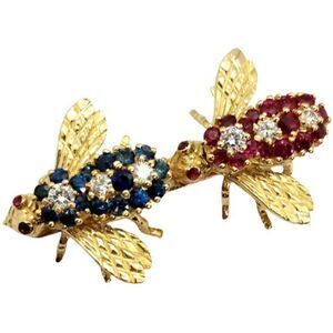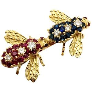 This listing is for a stunning vintage diamond, ruby, and sapphire 18K gold double bee brooch. This work of art displays beautifully and features a sparkly array of colour. This measures at approximately 49mm in length by approximately 30mm in width. This brooch would make a marvellous gift or addition to one's fine jewellery collection. The brooch you see in the photos is what you will receive. Don't miss out on this amazing item. If you have any questions, please feel free to ask. Thanks for looking.