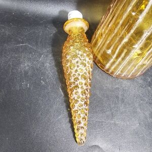 here is a listing for this vintage amber empoli genie bottle. made in Italy. This elegant gold glass bottle adds a touch of sophistication to any home decor. Its shimmering gold hue is perfect for enhancing your living space.