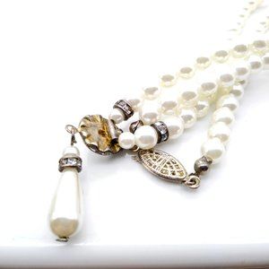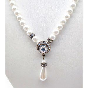 Elegant Vintage Faux Pearl Choker, White Strand Necklace with Rivoli Crystal and Teardrop Pendant, Classy Occasion Necklace
