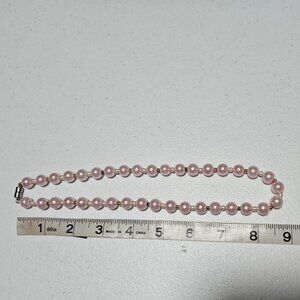 This elegant vintage necklace features pink faux pearls and a convenient magnetic clasp.