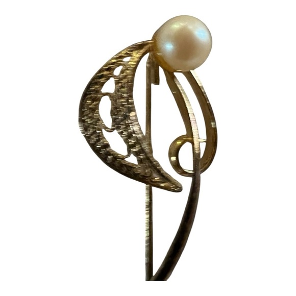This vintage stick pin brooch gold-tone lapel pin features a stunning gold design with a classic pearl accent, perfect for adding a touch of sophistication to any outfit.