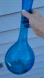 Enhance your home decor with this elegant blue glass vase. Its sleek design adds a touch of sophistication to any room. This item is in very good condition, with only a few light scratches that are hard to see. It is also dirty. I have no idea how to clean it and didn't want to chance damaging it. I have considered that when pricing it. See photos for measurements.