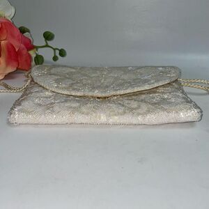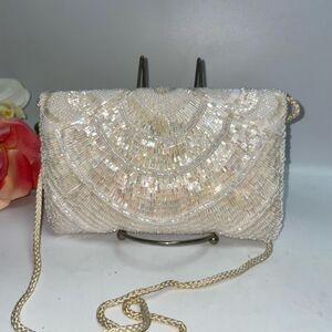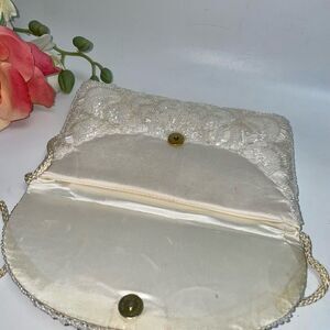 This elegant vintage Magid cream beaded clutch/purse is perfect for any special occasion. Its intricate design adds a touch of sophistication to your outfit. Carry it with confidence and style.