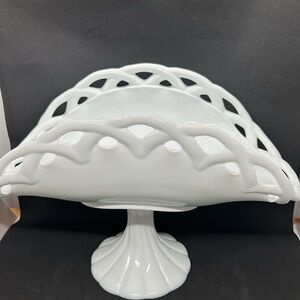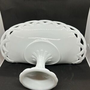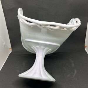 Enhance your dining experience with this elegant Vintage Milk Glass Pedestal Plate/Stand Banana Fenton Style Glass 13.5”X 7.5”x9