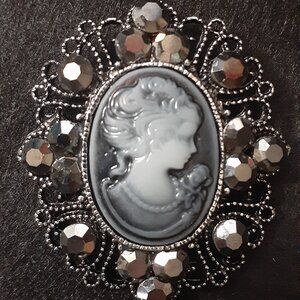 Elegant Vintage Style Victorian Queen's Cameo Brooch Pin with Rhinestones/Silver