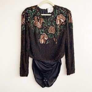 Elegant Vintage beaded bodysuit embellished unique 80s silk floral sequin event