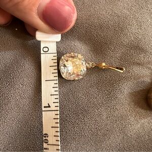 Elegant vintage-inspired drop earrings featuring large cushion-cut clear crystals set in gold-tone prongs. Accented with petite bezel-set stones and secure leverback hooks. These dazzling drops measure approx. 1.25” long and are perfect for weddings, parties, or elevating everyday outfits with classic glam. Light wear consistent with vintage condition.