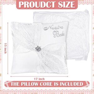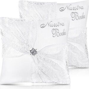 Features: This set includes two beautifully crafted satin and lace kneeling pillows with embroidered 'Nuestra Boda'. They feature large rhinestone flower embellishments, perfect for adding a stylish touch to your wedding ceremony. The pillows are soft, supportive, and large enough to comfortably kneel on during the vows.