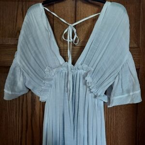 Beautiful flowing bathing suit cover-up. Short butterfly sleeves, button up front, pockets. Never worn but without tags. size 12-14. Cotton and polyester. Semi sheer. Ties at neck and waist.