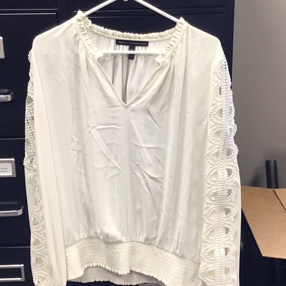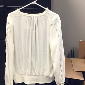 This elegant white blouse features intricate crochet sleeves, perfect for adding a touch of sophistication to any outfit. Ideal for both casual and formal occasions.