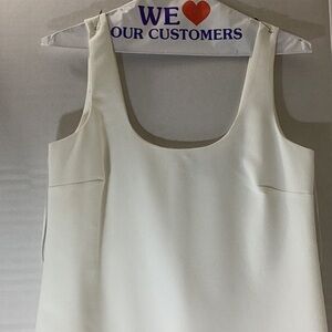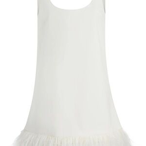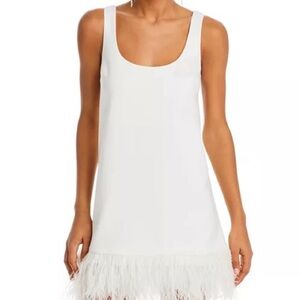 Chic white dress featuring a stylish feather hem. Perfect for special occasions. Scoop neck
