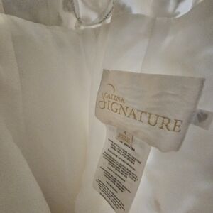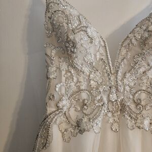 This stunning wedding dress features intricate embellishments and a classic white hue, perfect for your special day.
