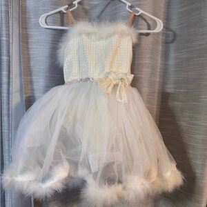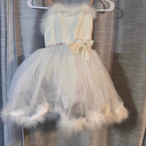 This elegant white kids dance costume is perfect for performances and special occasions. The fluffy trim adds a touch of charm, making it a delightful choice for your child's dance wardrobe.