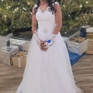 Worn once. This stunning white lace ball gown dress is perfect for special occasions. The intricate lace detailing adds a touch of elegance and sophistication. Ideal for making a memorable entrance. Petticoat not included & your size preference can be purchased from Amazon. *Stock photo to show fit*