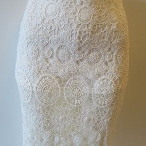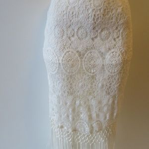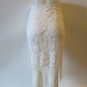 This elegant white lace skirt features intricate patterns and a stylish fringe hem. Perfect for adding a touch of sophistication to any outfit.