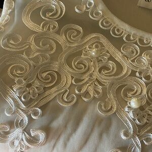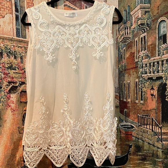 This elegant sleeveless top features intricate lace detailing, perfect for adding a touch of sophistication to any outfit. The white color offers a classic and versatile look. Size M/L