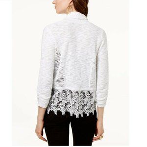 This elegant white sweater features a delicate lace trim, perfect for adding a touch of sophistication to any outfit. Ideal for both casual and formal occasions.