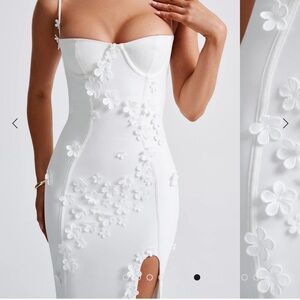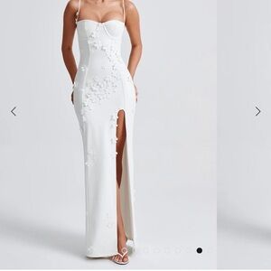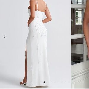 This stunning white maxi dress features delicate floral detailing and a flattering silhouette. Perfect for any special occasion.