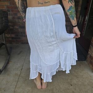 This asymmentrical white maxi skirt is perfect for any occasion. Its flowing design offers comfort and style, making it a versatile addition to your wardrobe. It does have some minor flaws that are shown in the pictures, but do not affect the wear nor look of the skirt. Because it is Drawstring, this skirt could comfortably fit a M-XL.