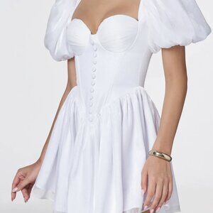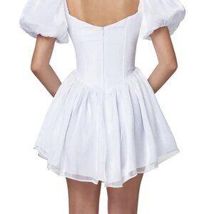 This elegant white mini dress features a chic design with puff sleeves and a fitted bodice. Perfect for any occasion, it offers a stylish and sophisticated look.
