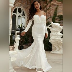 This stunning white off-shoulder dress is perfect for any special occasion. Its elegant design and flattering fit make it a must-have in your wardrobe.