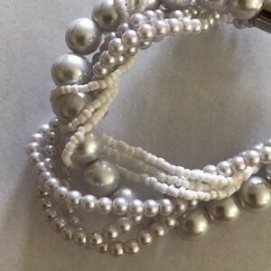 This stunning bracelet showcases a sophisticated multi-strand design, intertwining lustrous white faux pearls with sleek silver-toned metal strands. The harmonious blend of materials creates a timeless piece that exudes elegance and charm. New with tag. Smoke free home.