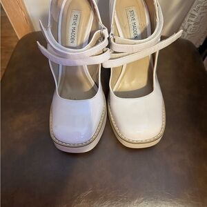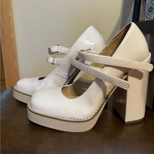 Step out in style with these elegant white platform Mary Jane heels. Perfect for any occasion, these shoes offer both comfort and sophistication.