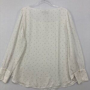 This elegant white blouse features a subtle polka dot pattern, perfect for any occasion. Its classic design offers a timeless look.