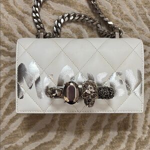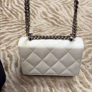 This elegant white quilted bag features a stylish chain strap, perfect for any occasion. Its sleek design and classic color make it a versatile accessory for your wardrobe. ***Please notice photo of slight discoloration on the bag from sunlight **